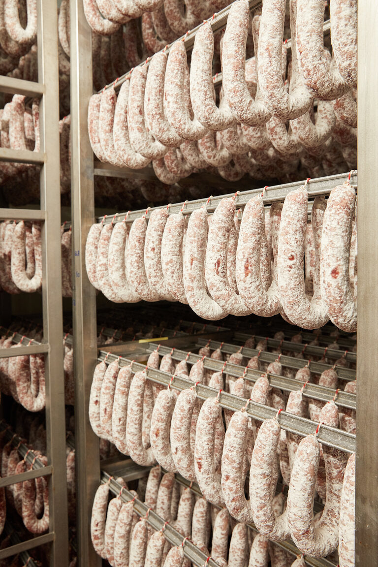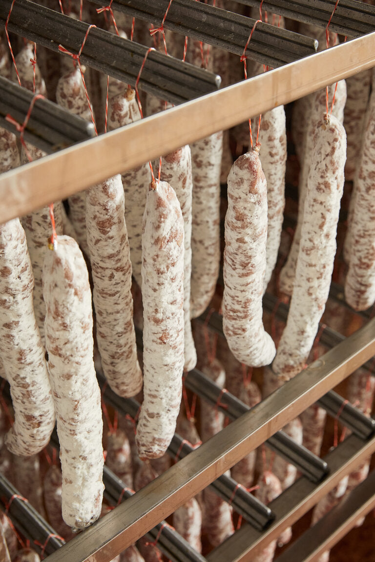 Venez faire un tour dans nos séchoirs ! Vous y retrouverez des odeurs de champignons forestiers dues au développement maîtrisé des fleurs naturelles blanches et grises sur nos saucissons ! Et parce que nous respectons notre produit, nous lui laissons le temps de sécher et de s’affiner lentement, ce qui nous distingue des productions industrielles.